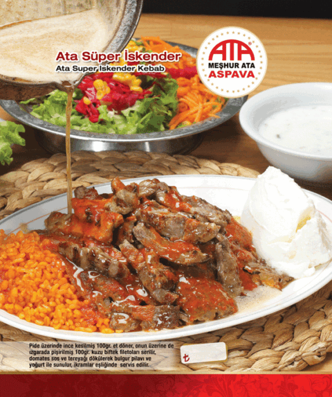 Meşhur Ata Aspava, İskender Döner Beyti Adana kaliteden taviz vermeden siz değerli müşteririne %100 Yerli Besi Et kullanarak servis sunmaktadır.